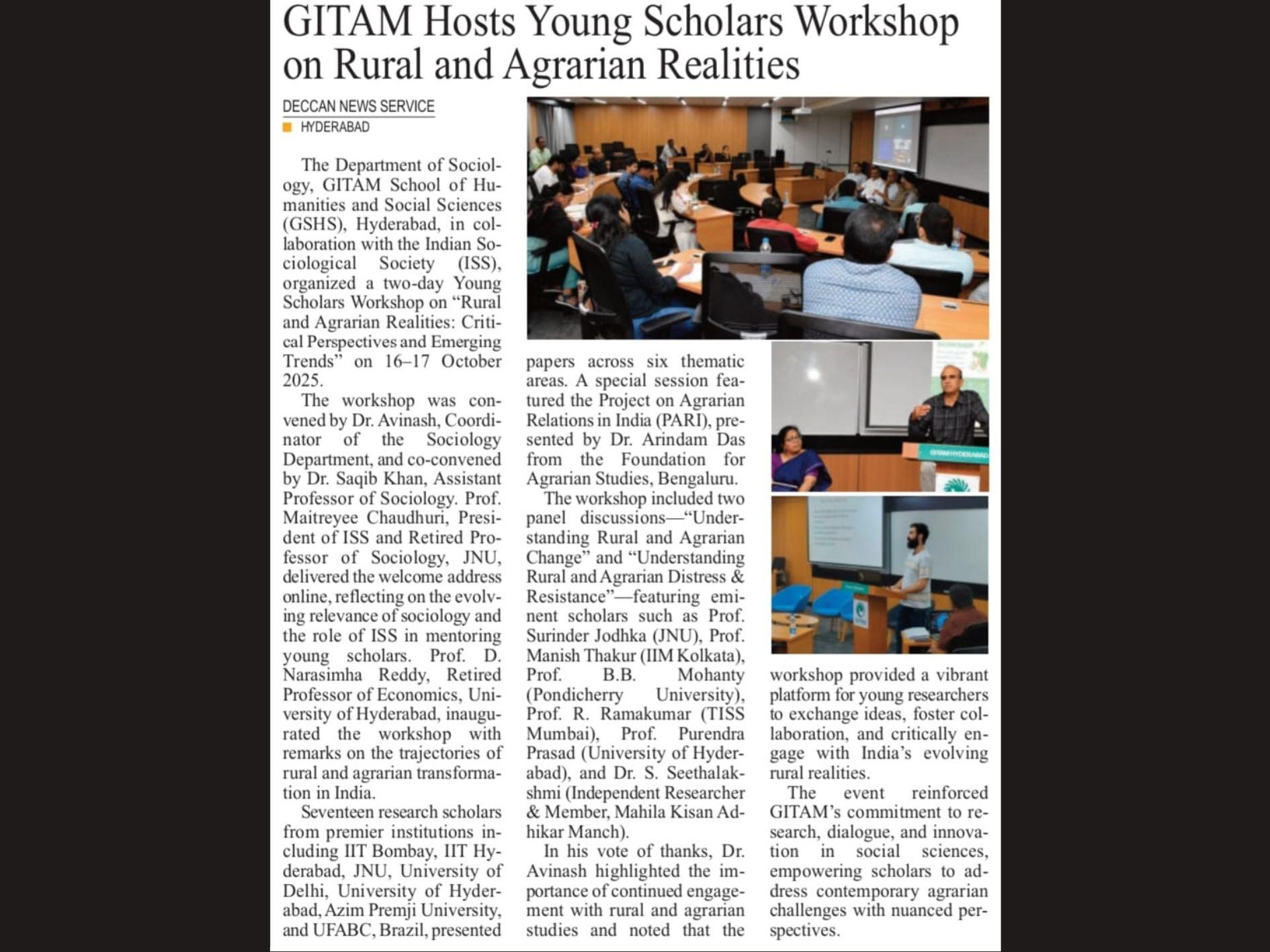 Organised by the Department of Sociology in collaboration with the Indian Sociological Society (ISS), the workshop featured research paper presentations by young scholars and panel discussions with eminent scholars. The event received media coverage, including in Deccan Vision.